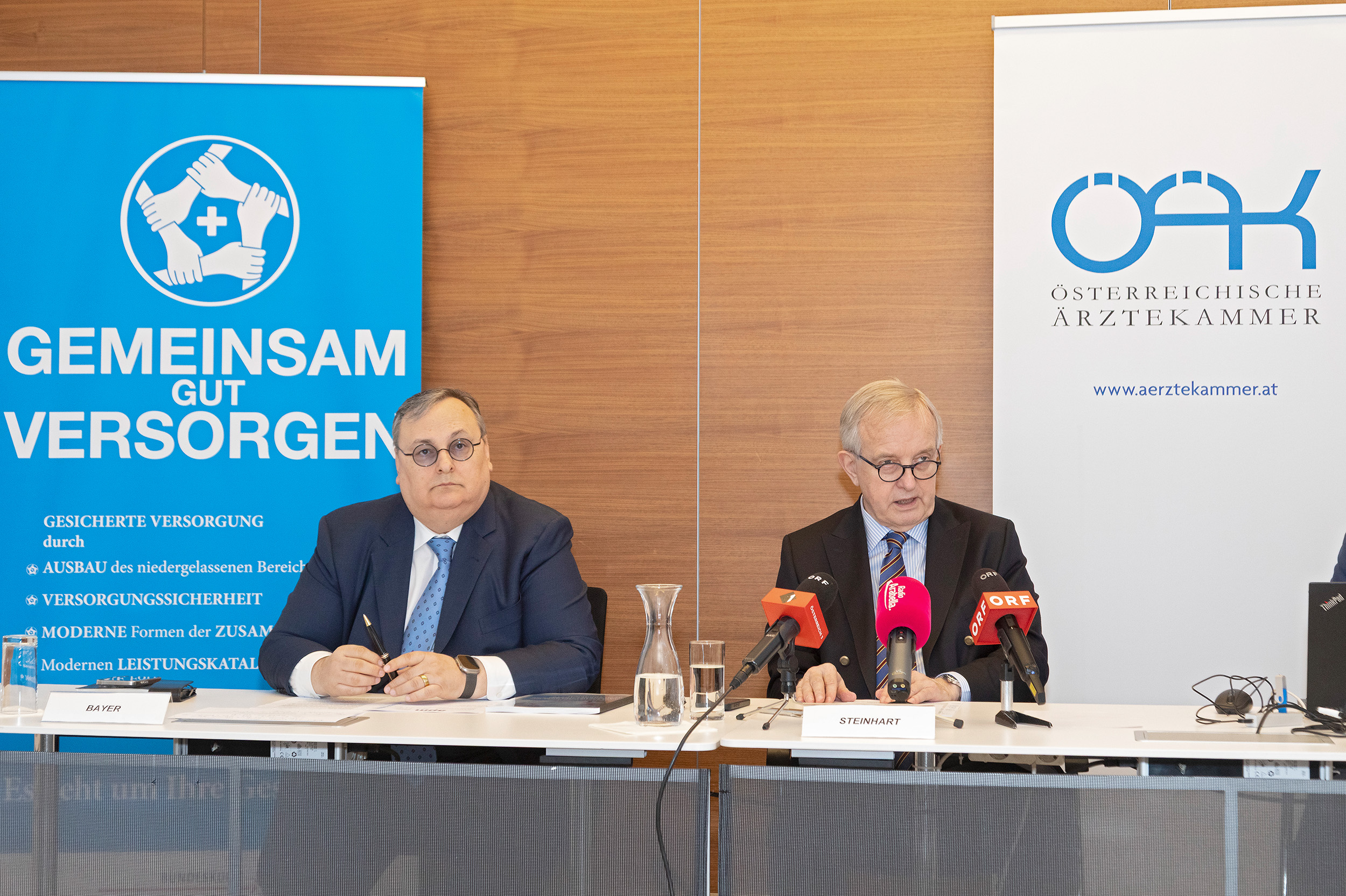 800 Millionen Euro, 900 Millionen Euro, eine Milliarde, dazwischen Konkurswarnungen: „Bei den Defizit-Prognosen der ÖGK schrillen bei uns die Alarmglocken, schließlich steht hier die Gesundheit unserer Patienten auf dem Spiel“, sagte Johannes Steinhart, Präsident der Österreichischen Ärztekammer, im Rahmen einer heutigen Pressekonferenz. Der genaue Blick auf ein entsprechendes Papier der ÖGK zeige eine lange Auflistung von Gründen für die finanziellen Nöte: Angeführt werden beispielsweise die schwächelnde Wirtschaft, die gestiegene Arbeitslosenquote oder der demographische Wandel. „Aber keine Zeile darin befasst sich mit den hausgemachten Strukturproblemen oder den noch nicht genützten Synergieeffekten aus der Kassenfusion“, kritisierte Steinhart. Stattdessen werde von Ärzten öffentlich ein „Solidarbeitrag“ eingefordert: „Diesen leisten Ärztinnen und Ärzte aber schon zu genüge, indem sie nämlich unter höchstem persönlichem Einsatz für ihre Patientinnen und Patienten eine Gesundheitsversorgung aufrechterhalten, die seit Jahren immer mehr ausgedünnt wird“, sagte Steinhart. Das System sei nicht auf die über neun Millionen Einwohner ausgelegt, führte Steinhart aus: „Ganz im Gegenteil: Es wurde durch die Kostendämpfungspfade jährlich zurückgestutzt. Das kann natürlich nicht auf Dauer funktionieren.“ Die Konsequenzen des Vorschlags eines „Solidarbeitrags“ seien „desaströs“, so der ÖÄK-Präsident: Es sei weder für junge Ärztinnen und Ärzte motivierend, ins Kassensystem einzusteigen, wenn der Vertragspartner öffentlich so agiere, noch für jene Ärztinnen und Ärzte, die nur noch wenige Jahre eine Kassenpraxis hätten oder jene, die schon länger schwanken, aus dem Kassensystem auszusteigen – immerhin sind ziemlich genau 10% der Kassenärzte bereits 65 Jahre alt oder älter: „Mit einem einzigen Satz hat der ÖGK-Obmann also der Motivation eines erheblichen Teils seiner Vertragspartner oder seiner potentiellen Vertragspartner eine eiskalte Dusche verpasst“, so Steinhart.